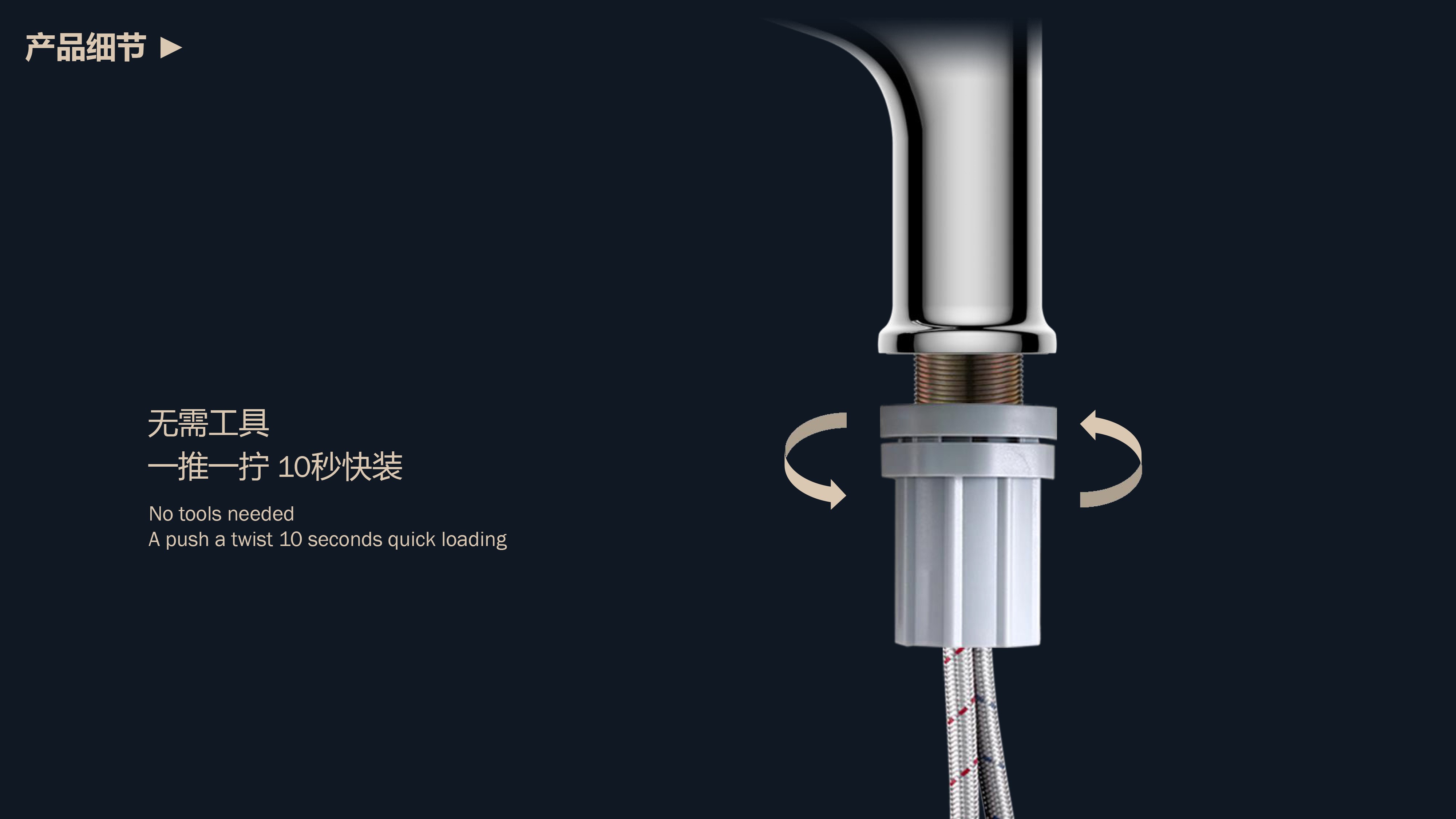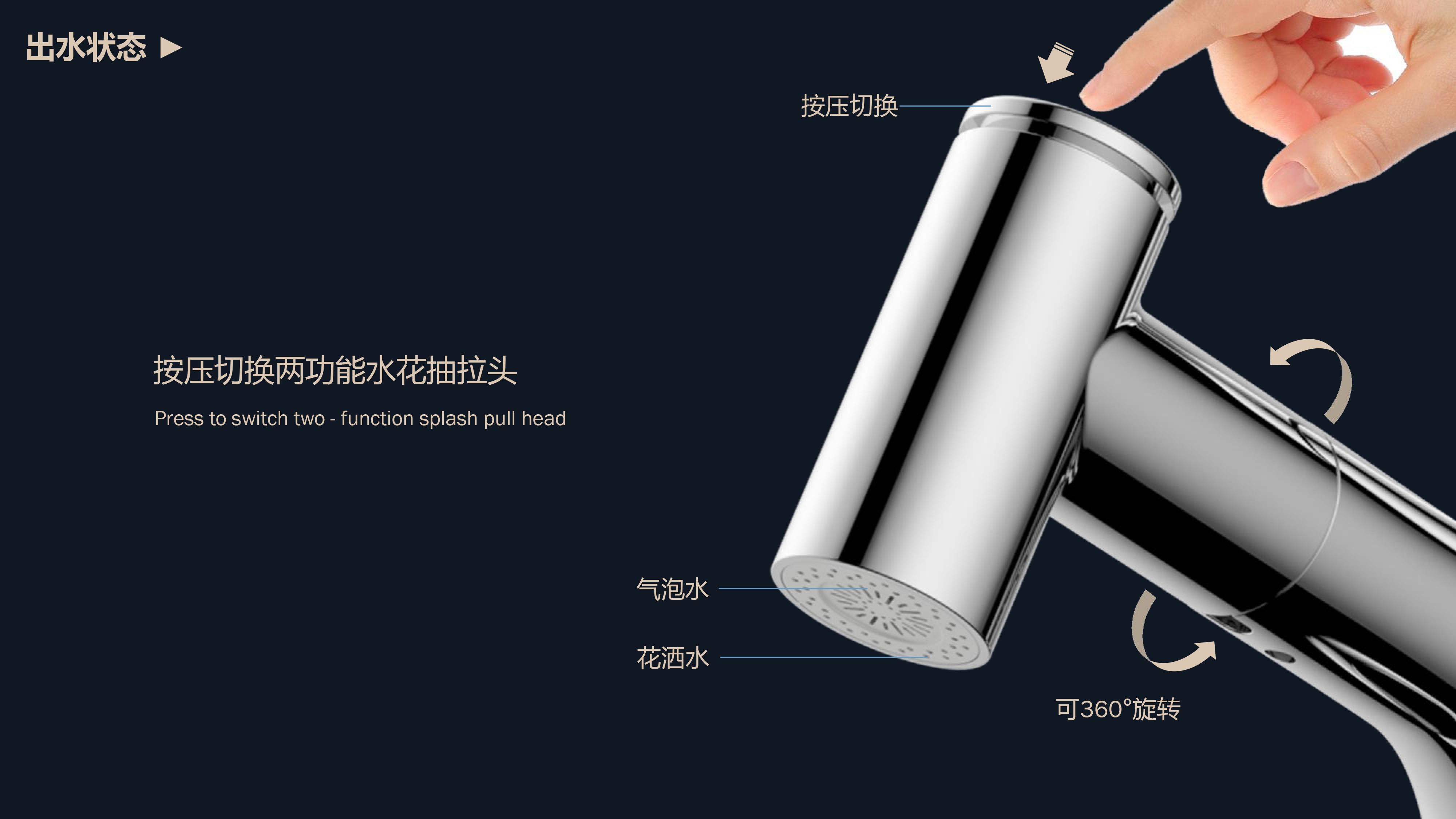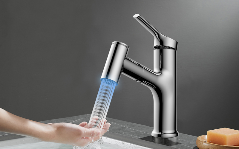 360°全方位抽拉清洗;微光龍頭,深夜使用不開大燈,不刺眼;日常洗頭利器,抽拉出水輕松洗;按壓切換兩功能水花;三種顏色LED燈光顯示水溫;重力錘復位設計,順暢伸縮,精準回位;無需工具,一推一擰10秒快裝