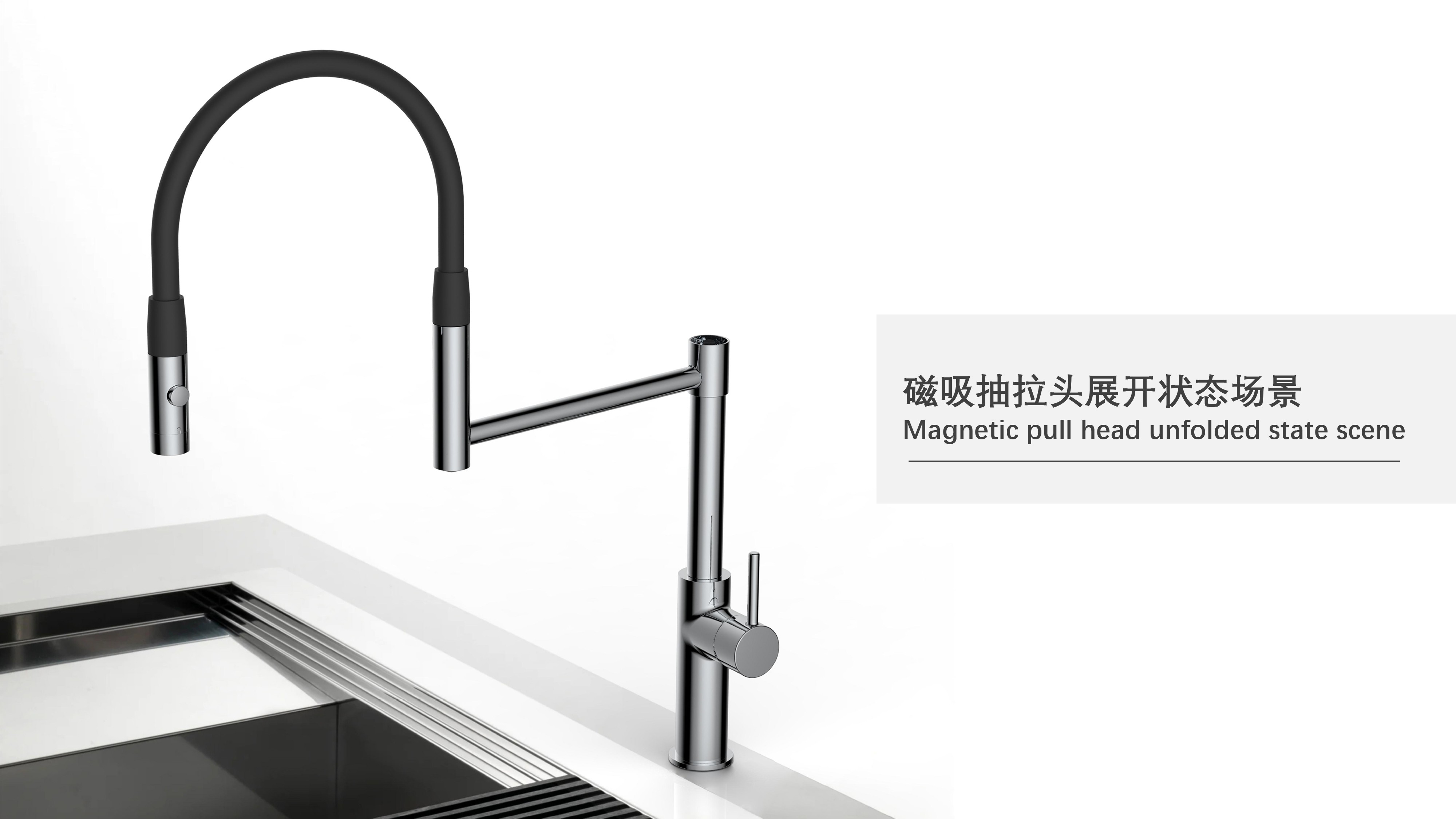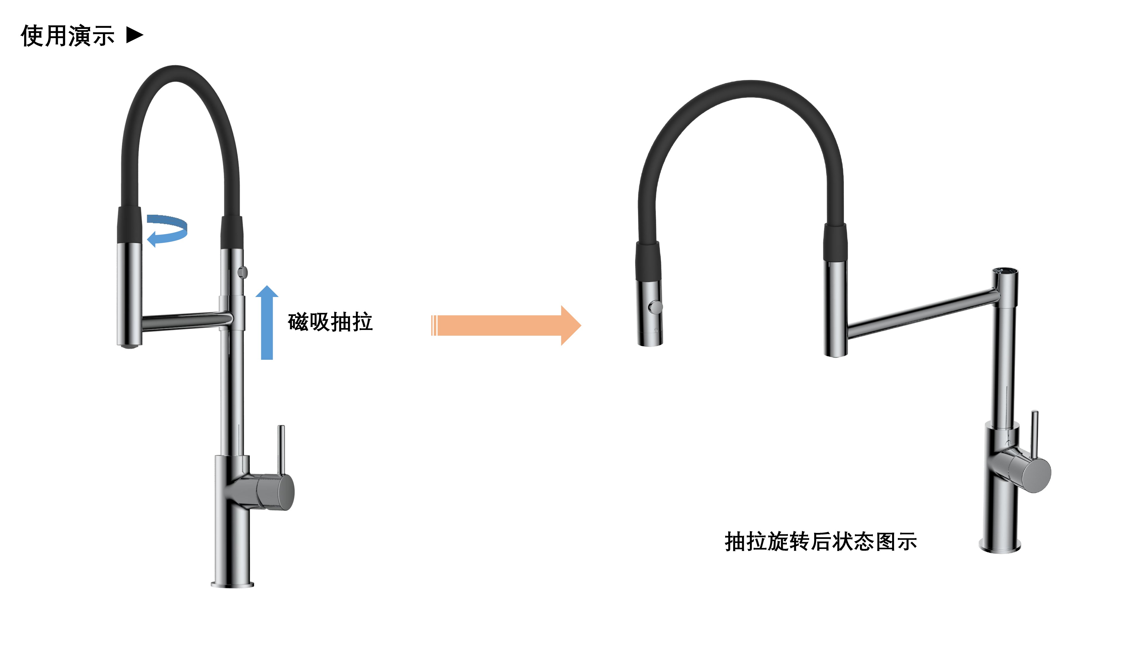 cUPC/ NSF61/ AB100/ NSF372/ Lead Free/ ADA認(rèn)證;磁吸抽拉廚房龍頭;磁吸抽拉頭可旋轉(zhuǎn)展開使用,不用時(shí)旋轉(zhuǎn)回原位磁吸固定;兩種出水可根據(jù)需求切換